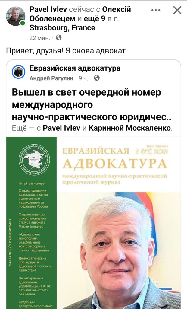 Павел Ивлев любил представляться адвокатом — да он и был адвокат — но случилась проблемка. Очень долгое время он числился адвокатом ни где-нибудь, а в конторе «Каганер и партнеры», которая, по сведениям наших источников, была очень тесно связана с Ростехом и лично Чемезовым. Связь сомнительная, но еще более сомнительно то, что уже будучи осужденными в России, Ивлев продолжал состоять там адвокатом. И был официально раскоронован (лишен адвокатского статуса) уже после наших публикаций. Но вот теперь он объявил в соцсетях, что он… снова стал адвокатом. Как обычно, от реальности это очень и очень далеко.
